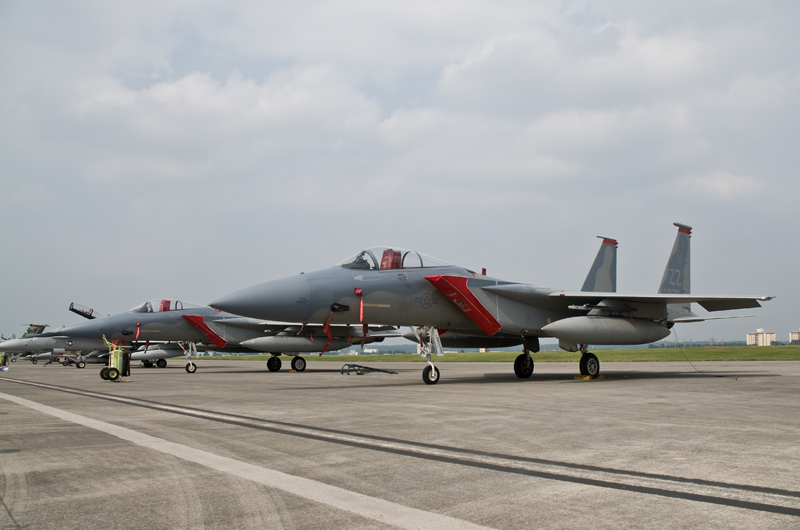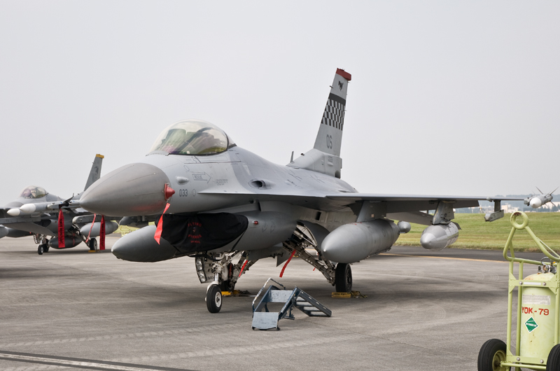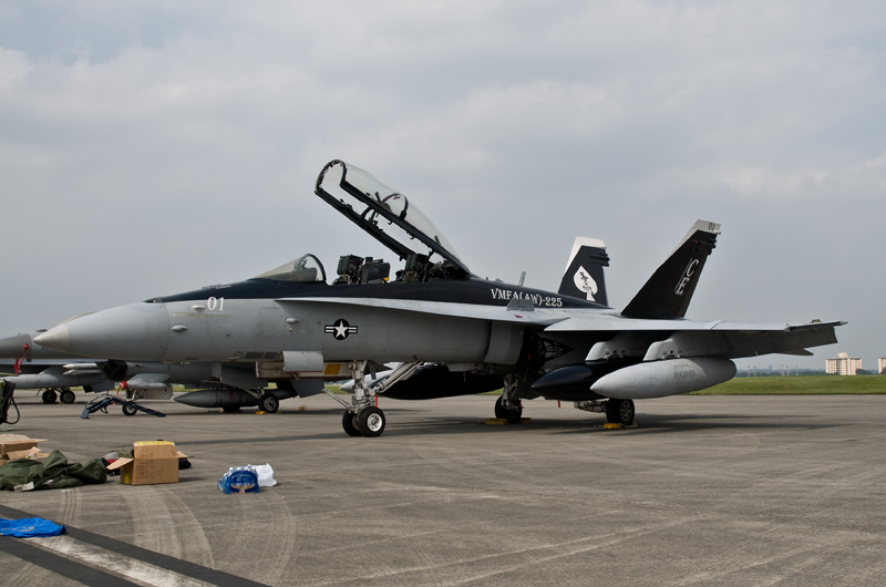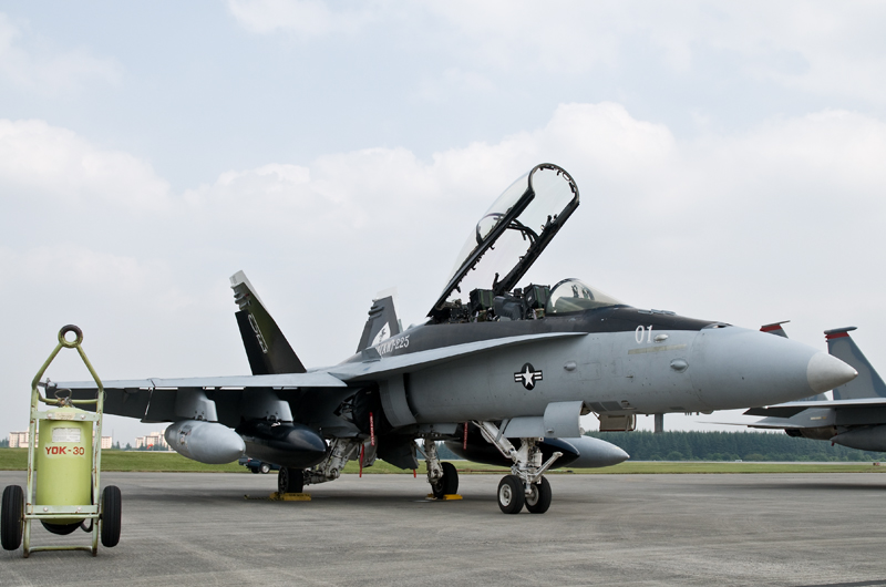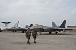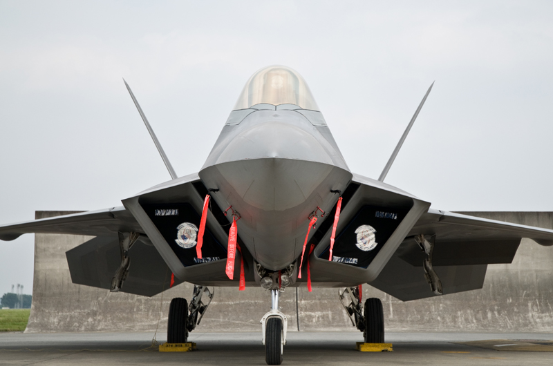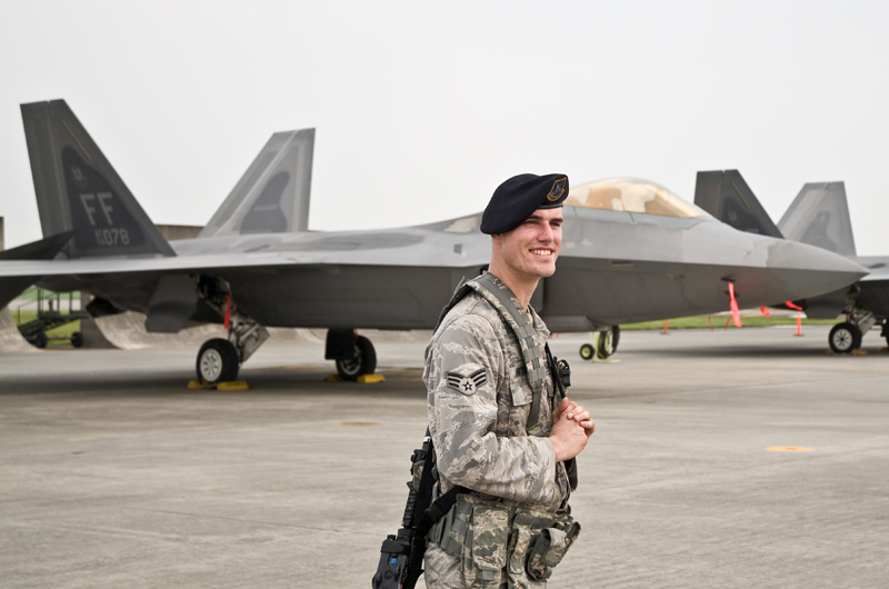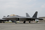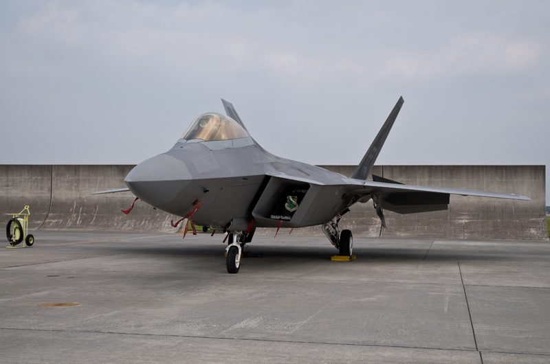 お腹もいっぱいになり適度にアルコールも摂取したところで行動開始。広いエプロンの端から順に地上展示機を撮影。本命のF22はエプロン地区の一番端のほうで、他の機体と比べロープから距離をとった位置に展示されていました。また、ここだけは銃をもった兵士が張り付き警備も厳重で、さすが最新鋭機といった感じです。