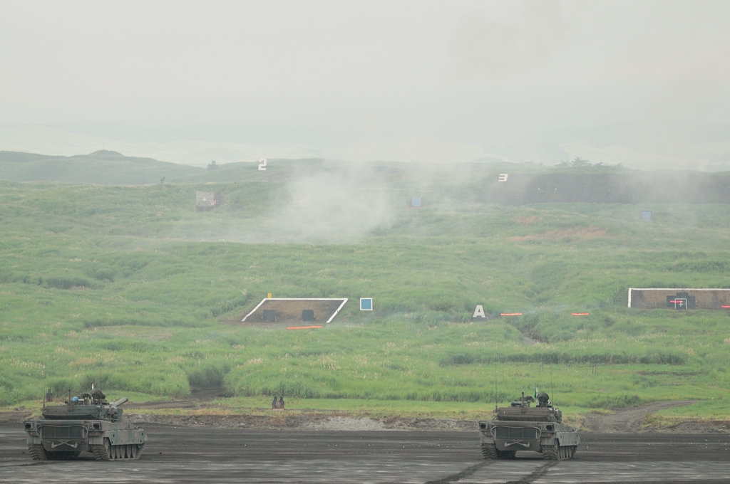 で、駐車場も開きクルマを置いて今度は入場待ちの列に並んでいるとポツポツと雨が。しかも試射が始まっても観覧席が邪魔で車両は見えず、いきなりの発射音に驚きまくり…