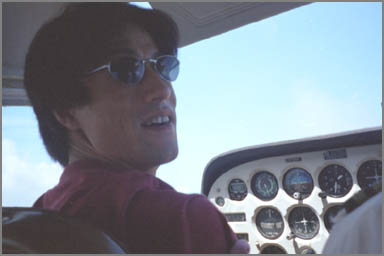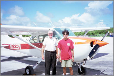 00年9月17日、晴れ。約束どおりの時間に、迎えの車がホテルのロビーに来てくれました。お、エスティマだ。でも、違う名前のエンブレムがバックハッチに付いてるなぁと思いながら、後席に乗りこむ。そして、陽気なレゲェをBGMに、車は体験フライトをする空港へ。いったいどこの空港から飛ぶのかなぁ、もしかして運動場みたいな土のランウェイなのかなと窓の外を眺めていると、なにやら道の向こうにコンチ機の尾翼が見える。エ~!サイパン国際空港から飛ぶの!?