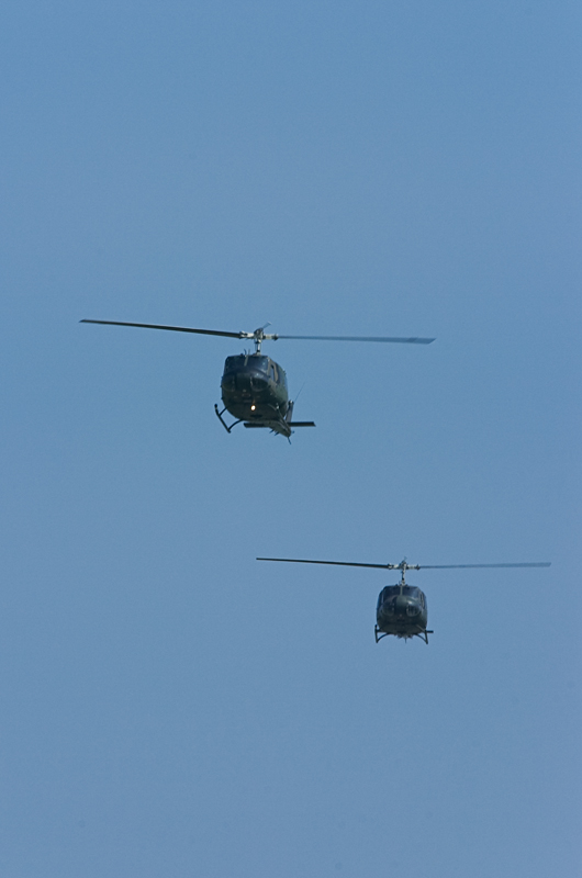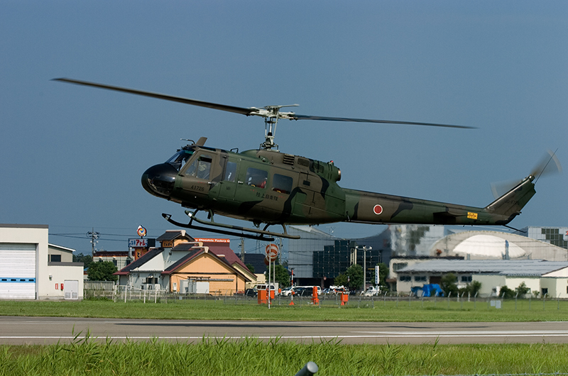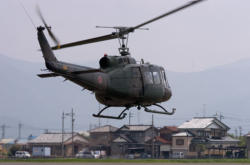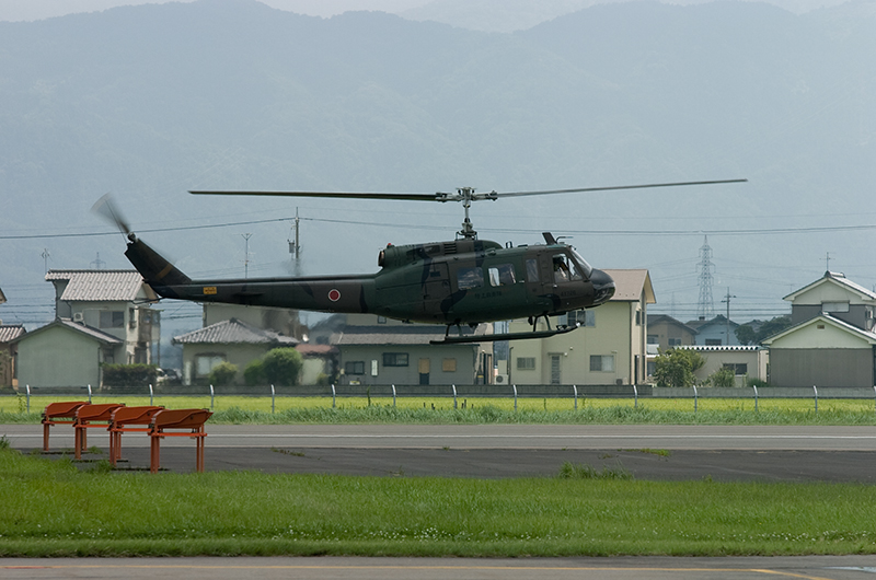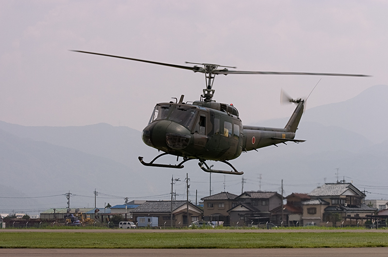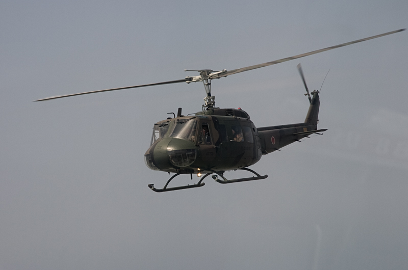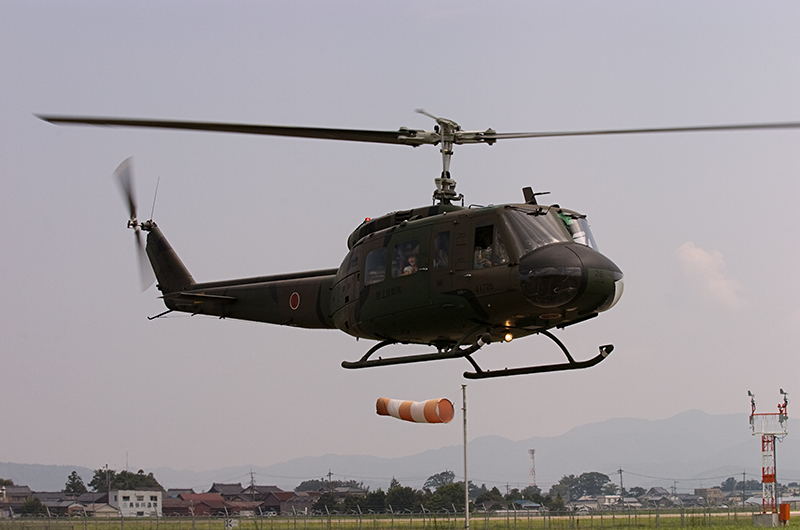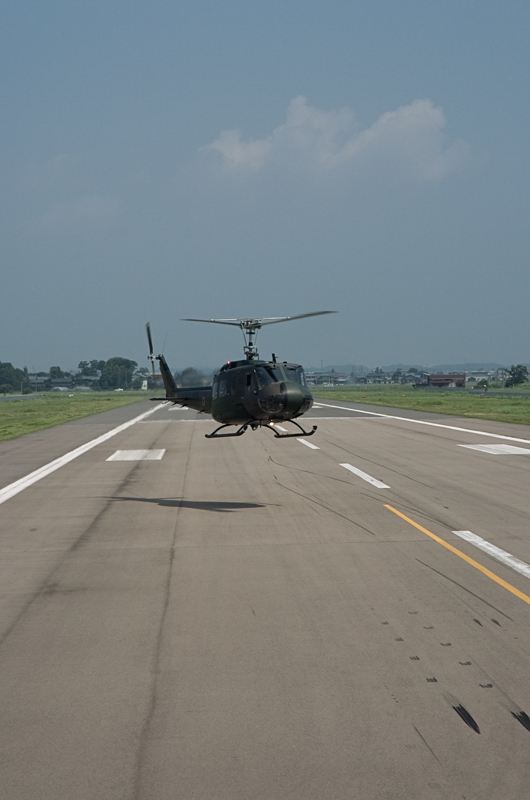 やはり乗せてもらう機体のアライバルは撮らないとと思い、集合時間の前に外から撮影。いつもUH-1の体験搭乗は2機で飛来しますが、2機がからむシーンは何度撮ってもドキドキします。